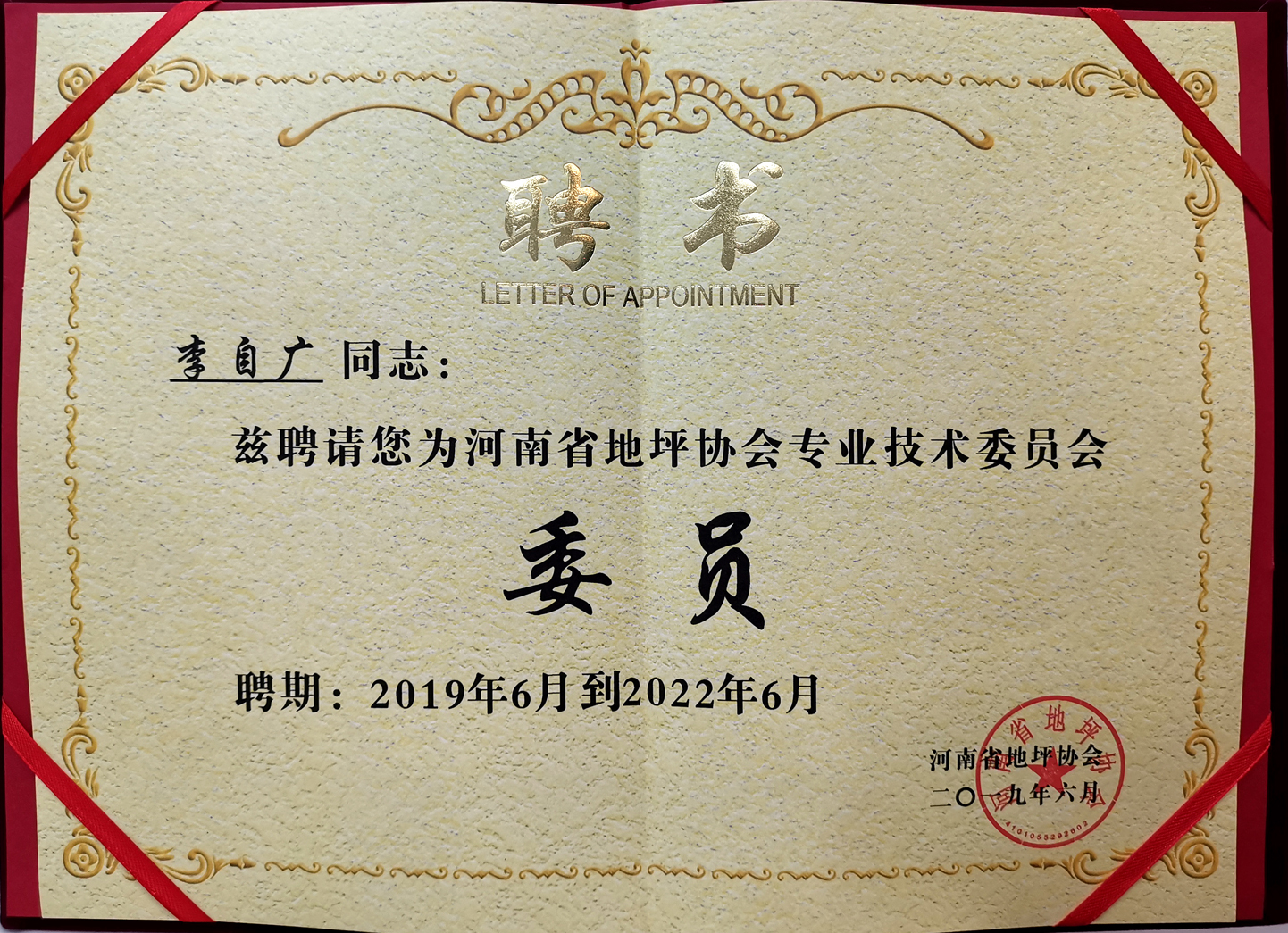 榮獲:河南省地坪協(xié)會(huì)**技術(shù)委員會(huì):“委員”稱號